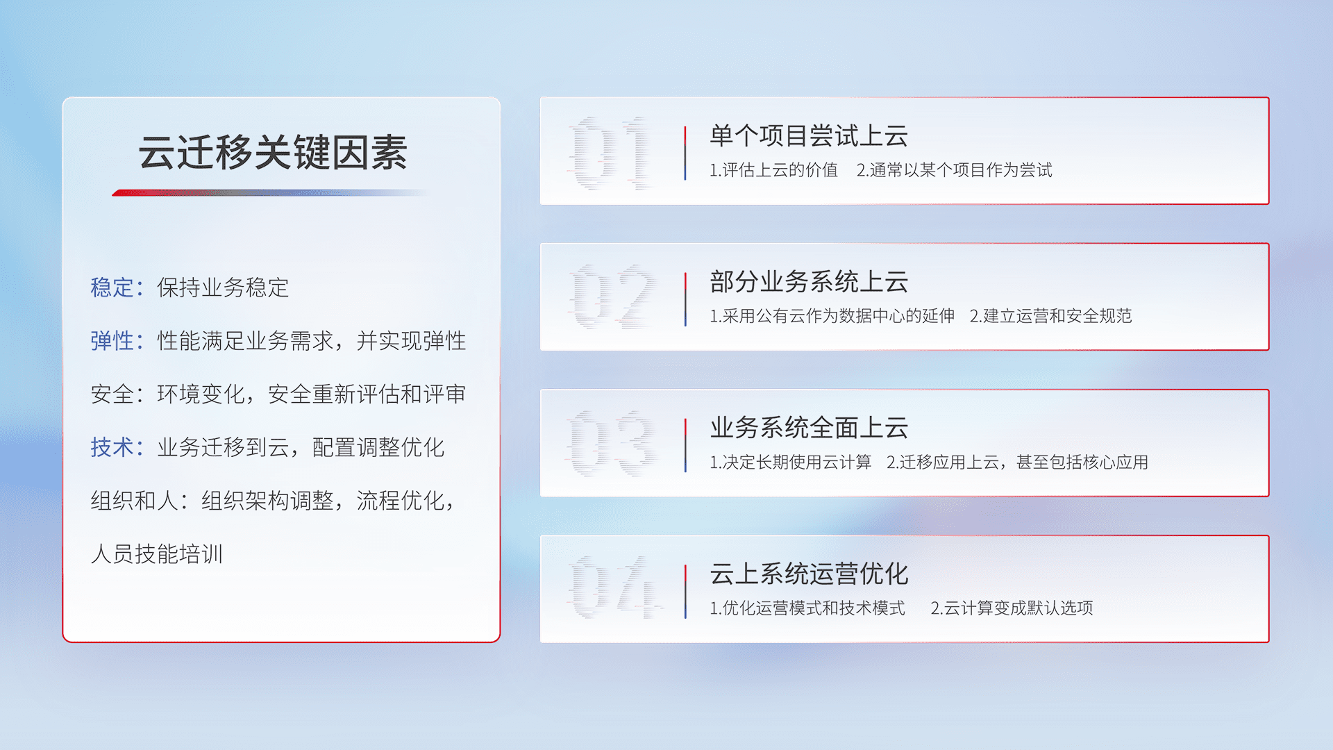 结合实际业务,,,从规划设计、、、云平台选型、、云原生改造、、数据迁移、、、集成交付,,,,迁移全过程为客户识别最佳上云路径,,做好风险识别管理,,设计网络架构、、、身份权限、、、、安全审计合规、、、操作审计、、、日志审计、、、、监控告警策略、、多站点容灾设计等,,对云上基础设施进行整体规划,,,,提升IT治理水平,,,以满足弹性、、高可用、、高性能的需求。。。