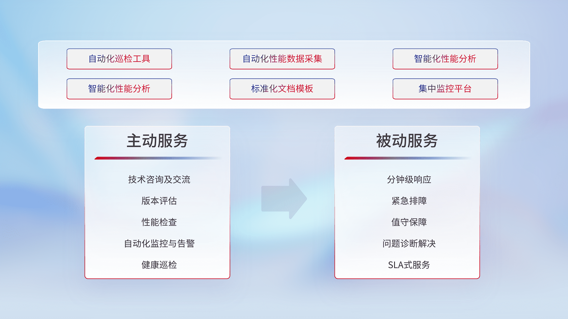 智能化工具和标准化文档,,,保障服务质量,,,提供主动服务(包含技术咨询、、、版本评估、、、、性能检查、、、、自动化监控与告警、、、、健康巡检)和被动服务包含(分钟级响应、、、、紧急排障、、、、值守保障、、、问题诊断解决、、、SLA服务)。。。。